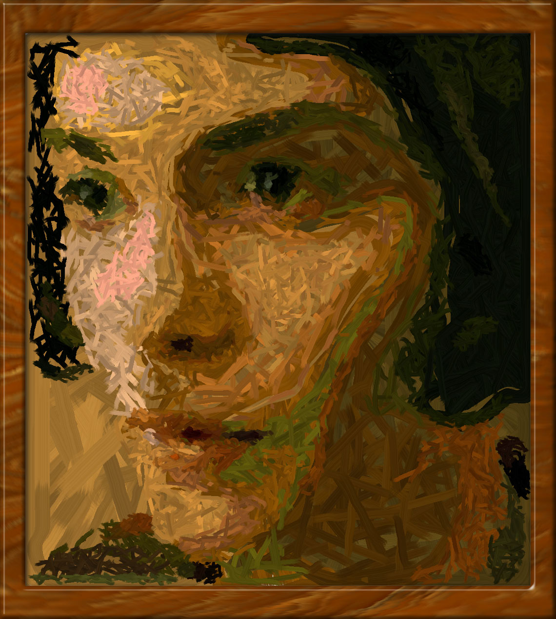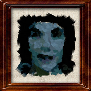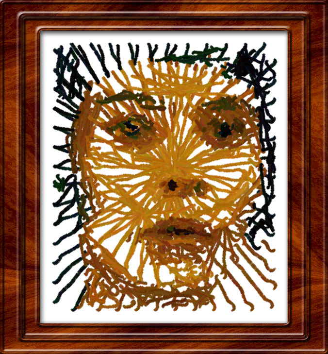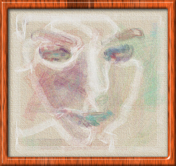 I concentrate here entirely on the facial features and use a quick, slapdash painting style. I use a modern palette and try to place all the colours somewhere on the canvas. The effect is similar to (but more colourful than) that in gallery picture #78.