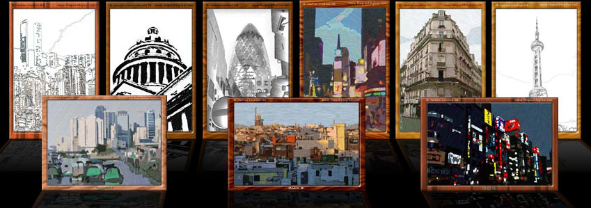 This was the first series of images I put together, when I was still being taught some basic non-photorealistic rendering techniques, such as how to segment an image; how to simulate inks, charcoals, chalk, coloured pencils, graphite pencils and acrylics; and how to outline and fill regions of colour in. These pictures are a collection of paintings and sketches of some of the most exciting cities in the world: Hong Kong, Havana, London, New York, Paris, Shanghai, Madrid and Tokyo.